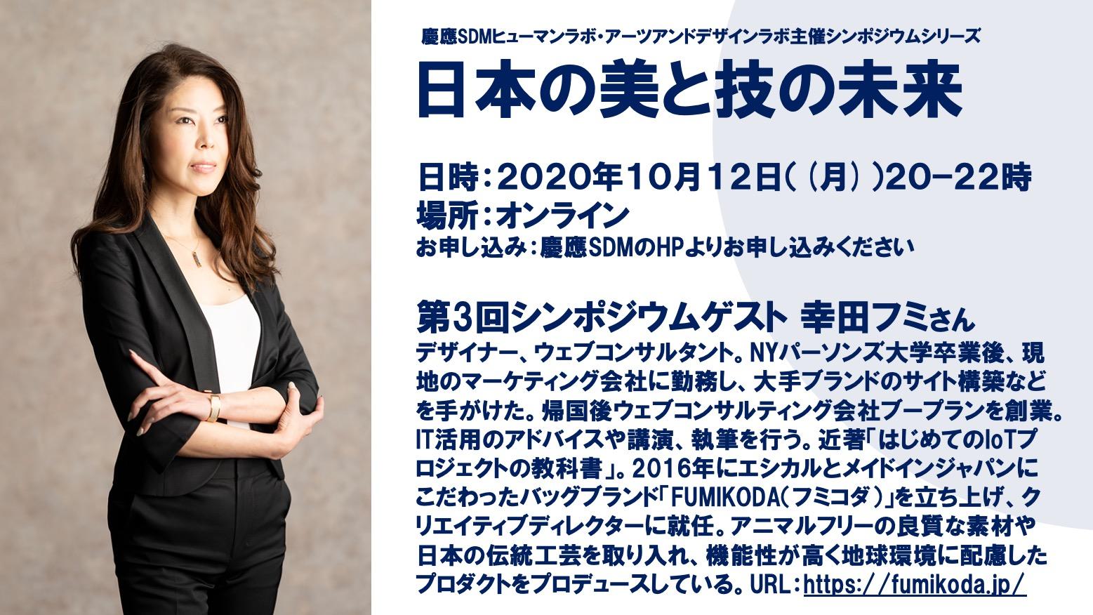 | 趣旨 | 慶應SDMヒューマンラボでは、日本の「美」にフォーカスしたシンポジウムシリーズを開催いたします。ファッション、和服、食、建築、茶道、華道、書道、写真、絵画、伝統工芸、伝統芸能、宗教、などなどに引き継がれてきた美と技について、ゲストの方のお話をお聞きするとともに、日本の美と技を貫く基本メカニズムを構造化することを目指します。