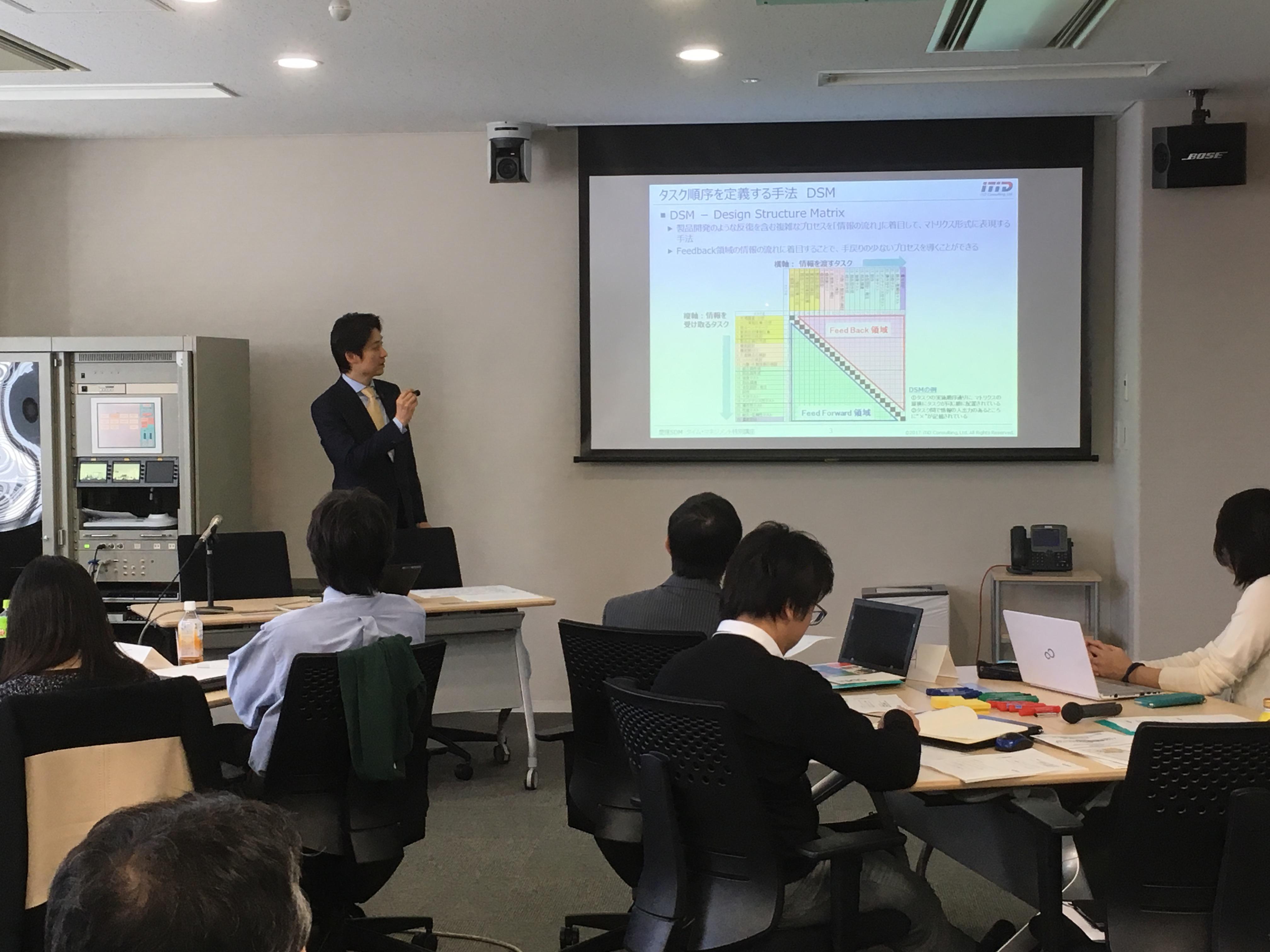 講座ではタイム・マネジメントの重要性、DSM(デザイン・ストラクチャ・マトリクス)を活用した計画作成、 日程短縮の8つのワザ等について、当麻教授、西村教授、および協力いただいた(株)iTiDコンサルティングの 蟹江氏から、演習を含めた講義を行いました。演習では、「人型お片付けロボット」を開発するプロジェクトを 想定し、製品アーキテクチャを考えながらグループワークを行って開発計画を立てることで、システムズエンジ ニアリングの視点を加えたプロジェクトマネジメント手法として、SDMオリジナルのプログラムを展開し、実践的 なスキル習得を目指しました。