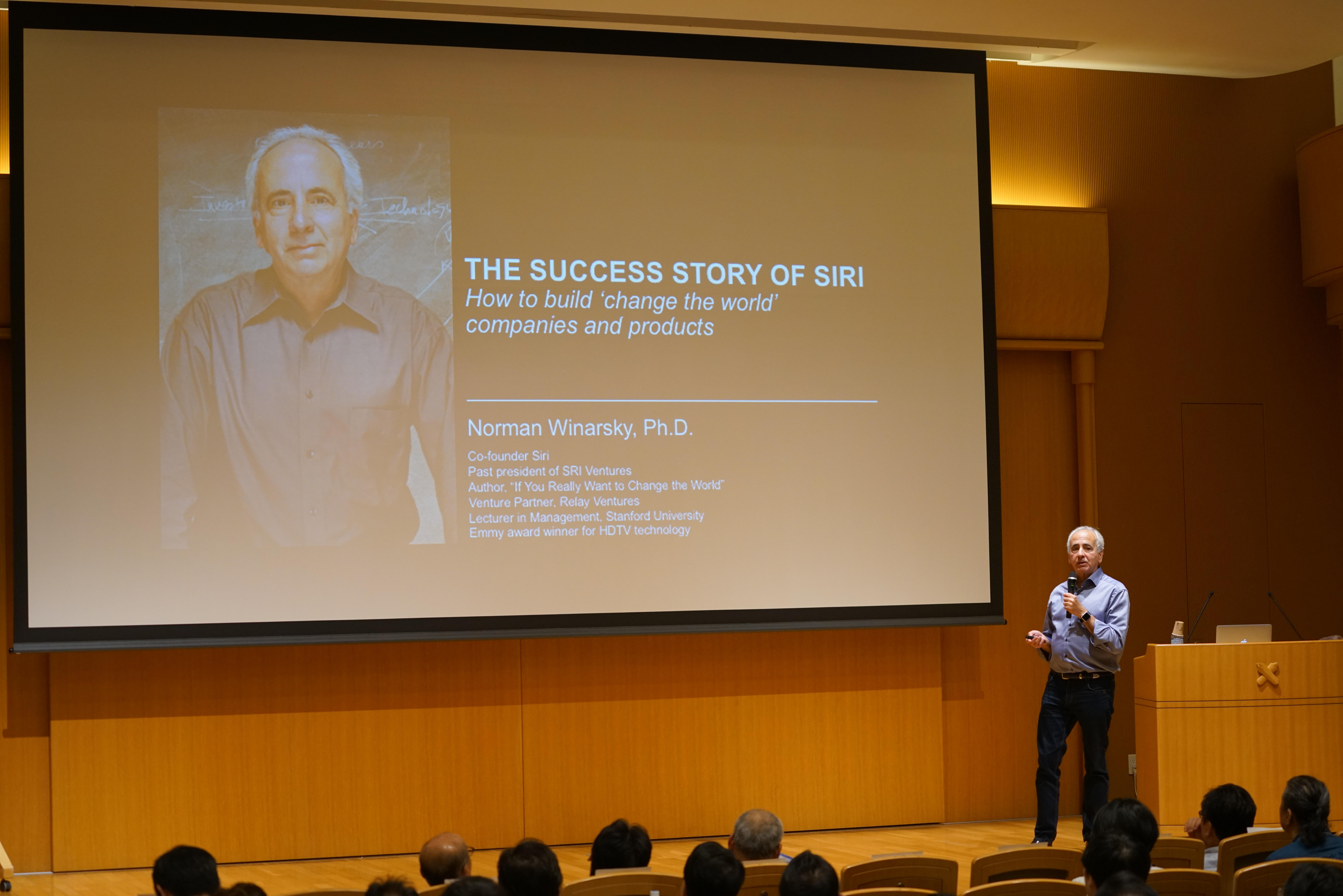 講演では経済産業省経済産業政策局 産業創造課の佐々木啓介課長から「世界に貢献できる第五次産業革命を目指して」の話題が提供されました。続いてStanford University lecturer、Winarsky Ventures CEO、元SRI International, Venture PresidentのDr. Norman Winarskyから、Siri等米国で数々の成功事例を達成した経験に基づき、「Siri/AI から学ぶ 世界を変える」とのテーマで、日本企業の競争力の再生に資する新しいビジネスを創造するための考え方の指針が示されました。そして慶應SDM研究科の中野冠教授(グローバルことものづくり研究ラボ代表)から「なぜ日本でイノベーションが起きないか?」、慶應義塾大学大学院 経営管理研究科の岩本隆特任教授から「ディープテクノロジースタートアップ」、元東京精密代表取締役、元NECでIPN株式会社の長澤英二副社長から「失われた30年を打ち破る創造的破壊」について話を頂きました。