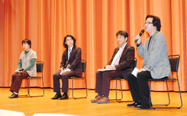 The Movie in the Dark @ Campus Theatre (MID_ACT) 2010 titled "There is happiness you can see when you close your eyes" attracted more than 100 moviegoers on November 13. "Shiawase Kazoku Keikaku", a movie produced by Shochiku that features voice guidance, was also screened. Afterward, Tsutomu Abe, the director of the film, Prof. Takashi Uchiyama from the School of Cultural & Creative Studies of Aoyama Gakuin University, Toshiyuki Kajiwara, manager of Cinema Jack and Betty (a theatre), and Keiko Saito, chairperson of City Light Film Festival planning committee participated in a panel discussion on voice guidance.