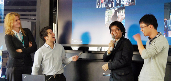 On January 14, exchange students from TU Delft made presentations on what they had learned during their stay at SDM to SDM students and faculty members. The visiting students from TU Delft's Faculty of Technology and Policy Management (TPM) were Fransien RUIJTER, Sander LUSTENHOUWER, Hao ZHANG, Qing Ye, and Thomas MULDER. Fransien enjoyed sightseeing throughout Japan, from Hokkaido to Okinawa. Sander's favorite memory is playing baseball with Japanese members in a baseball club. Hao was moved by the kindness of Japanese who helped him when he was lost, and Qing enjoyed the good food he had in various regions in Japan.